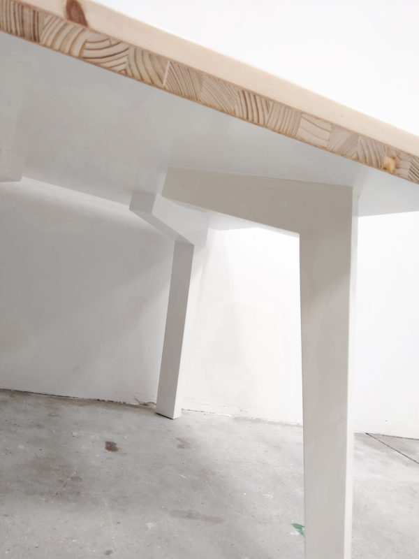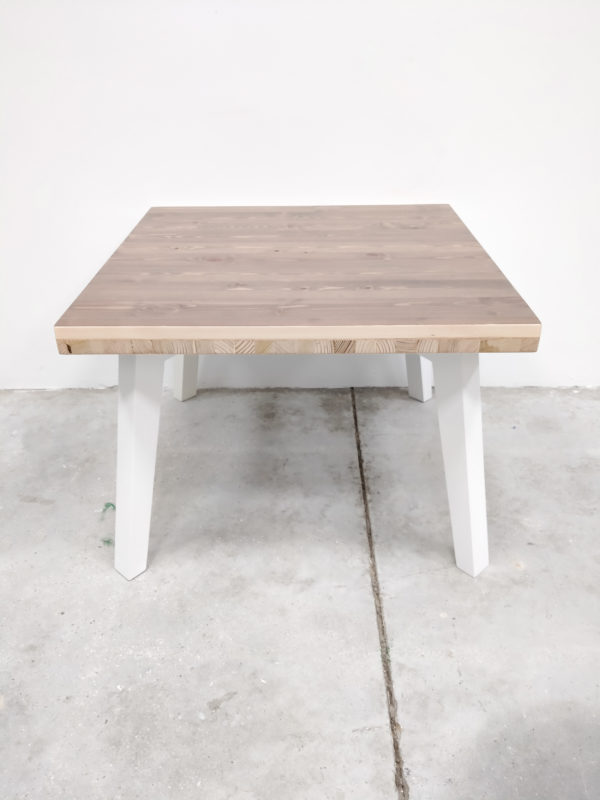 Cette table basse carrée, affiche un plateau en lattes de résineux massif au veinage rehaussé par une teinte chêne fumé. Quatre pieds en latté soutiennent le plateau, ils sont biseautés dans leur profondeur, trois pieds sont blancs et l’un est crème afin d’ajouter une touche de singularité.
