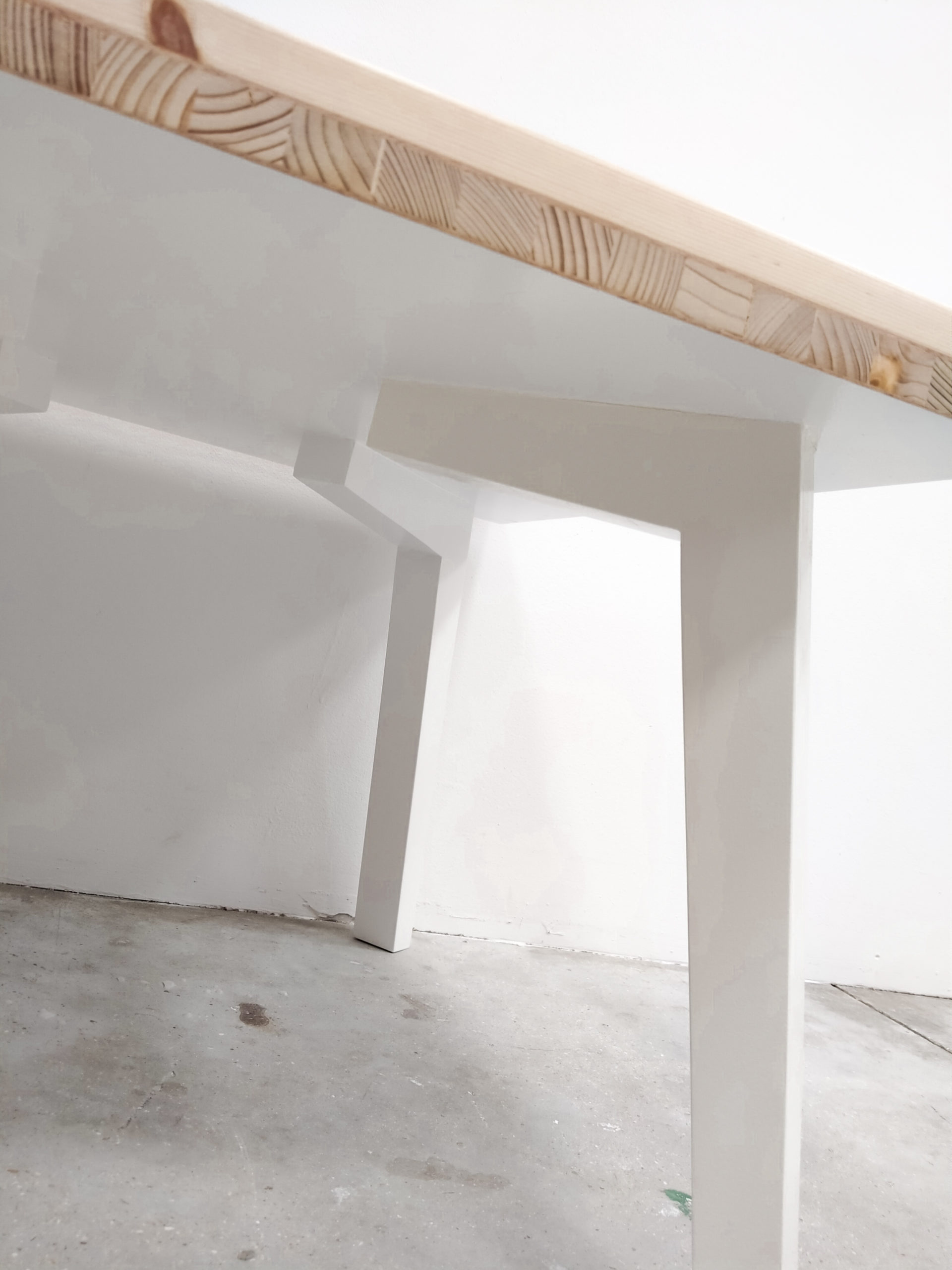 Table basse au plateau de lattes bois fumé et au piètement blanc et blanc cassé